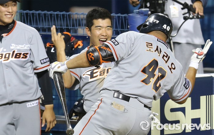 (서울=포커스뉴스) 14일 서울 잠실구장에서 열린 2016 프로야구 한화-LG 경기 7회초 2사후 한화 로사리오가 우중월 솔로 홈런을 치고 덕아웃에서 정근우와 손가락 마주치기를 하고 있다.