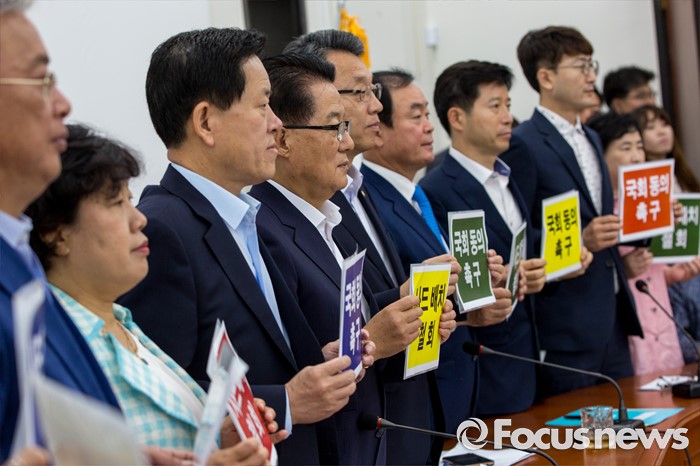 (서울=포커스뉴스) 박지원(왼쪽 네 번째) 국민의당 비상대책위원장을 비롯한 지도부, 비대위원들이 15일 오전 서울 여의도 국회에서 열린 비대위원-중진의원 연석회의에 참석해 '새드배치 철회, 국회동의 촉구'란 문구가 적힌 피켓을 들고 사진촬영을 하고 있다.