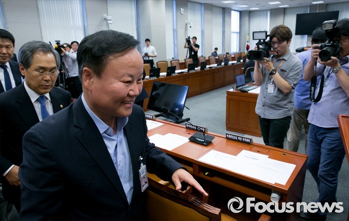(서울=포커스뉴스) 15일 오전 서울 여의도 국회에서 예정된 운영위원회 전체회의에 참석한 김재원(오른쪽) 청와대 정무수석과 우윤근 국회 사무총장이 관계자로부터 회의 취소와 관련 설명을 들은 뒤 퇴장하고 있다. 이날 새누리당은 더불어민주당 소속 홍영표 국회 환경노동위원장이 야당 단독으로 예비비 지출안 등을 처리한 것과 관련해 홍 위원장의 사퇴를 요구하며 모든 상임위 보이콧을 선언했다.