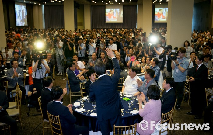 한편, 서청원 의원의 당 대표 출마 여부에 대해서는 "서 의원이 경륜있는 분이라 당이 쪼개져 있는 것을 큰 그릇에 녹여 계파정치 통합할 수 있도록 앞장섰으면 좋겠다는 많은 의견이 있다. 그런데 아직 정작 서청원 의원이 고민하고 계신 것 같다"고 덧붙였다.14일 오후 서울 영등포구 그랜드컨벤션센터에서 열린 당대표 취임 2주년 행사에 참석한 김무성 새누리당 전 대표가 지지자들을 향해 인사하고 있다. 2016.07.14 박동욱 기자