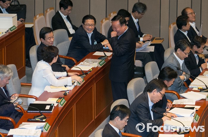 (서울=포커스뉴스) 15일 오전 서울 여의도 국회에서 예정된 예산결산특별위원회 전체회의에 참석한 김재원 청와대 정무수석이 국무위원들과 회의 시작을 기다리며 대화하고 있다. 이날 새누리당은 더불어민주당 소속 홍영표 국회 환경노동위원장이 야당 단독으로 예비비 지출안 등을 처리한 것과 관련해 홍 위원장의 사퇴를 요구하며 모든 상임위 보이콧을 선언했다.