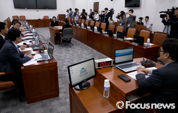 (서울=포커스뉴스) 15일 오전 서울 여의도 국회에서 예정된 가습기살균제 사고 진상규명과 피해구제 및 재발방지 대책 마련을 위한 국정조사특별위원회 전체회의에 참석한 야당 의원들이 새누리당 의원들을 기다리며 회의 진행을 하고 있다. 이날 새누리당은 더불어민주당 소속 홍영표 국회 환경노동위원장이 야당 단독으로 예비비 지출안 등을 처리한 것과 관련해 홍 위원장의 사퇴를 요구하며 모든 상임위 보이콧을 선언했다.