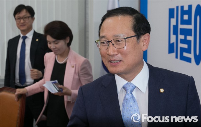 (서울=포커스뉴스) 15일 오전 서울 여의도 국회에서 홍영표 국회 환경노동위원장과 야당 환노위원들이 결산 표결 관련 입장을 전하는 기자간담회를 마친 뒤 퇴장하고 있다. 이날 새누리당은 더불어민주당 소속 홍 위원장이 야당 단독으로 예비비 지출안 등을 처리한 것과 관련해 위원장 사퇴를 요구하며 모든 상임위 보이콧을 선언했다.