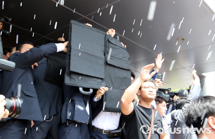(성주=포커스뉴스) 황교안 국무총리와 한민구 국방부장관이 15일 오전 경북 성주군청광장에서 사드(THAAD, 고고도미사일방어체계) 배치에 대한 주민설명회를 가진 가운데 성난 주민이 물병과 소금, 계란을 투척하고 있다.