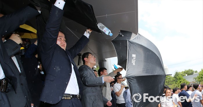 (성주=포커스뉴스) 황교안 국무총리와 한민구 국방부장관이 15일 오전 경북 성주군청광장에서 사드(THAAD, 고고도미사일방어체계) 배치에 대한 주민설명회를 가진 가운데 성난 주민이 물병과 소금, 계란을 투척하고 있다.