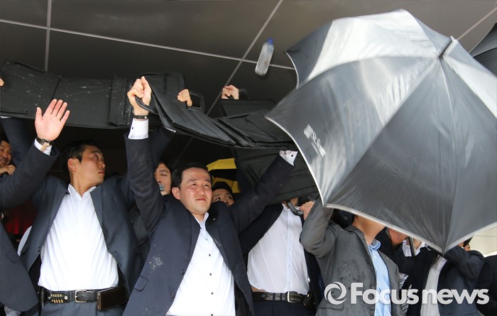 (성주=포커스뉴스) 황교안 국무총리와 한민구 국방부장관이 15일 오전 경북 성주군청광장에서 사드(THAAD, 고고도미사일방어체계) 배치에 대한 주민설명회를 가진 가운데 성난 주민이 물병과 소금, 계란을 투척하고 있다.