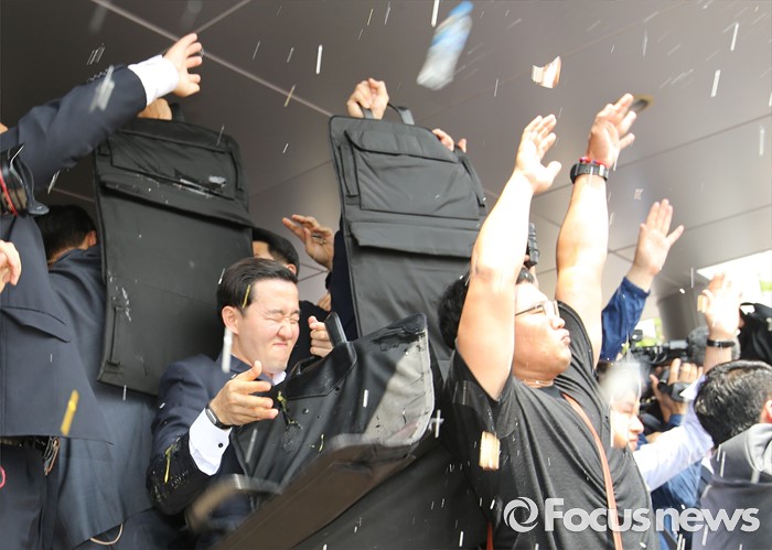 (성주=포커스뉴스) 황교안 국무총리와 한민구 국방부장관이 15일 오전 경북 성주군청광장에서 사드(THAAD, 고고도미사일방어체계) 배치에 대한 주민설명회를 가진 가운데 성난 주민이 물병과 소금, 계란을 투척하고 있다.