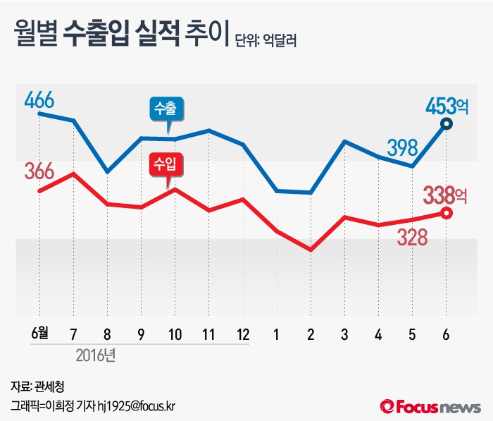 (서울=포커스뉴스) 15일 산업통상자원부는 지난 6월 수출액이 453억달러, 수입액은 328억달러를 기록했다고 밝혔다.