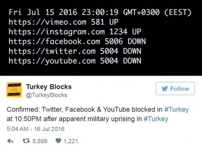 16일 영국 가디언에 따르면 터키의 온라인 검열 감시단체 터키 블록(Turkey Blocks)은 트위터를 통해 "페이스북, 트위터, 유튜브가 차단됐다. 비메오(동영상 공유사이트)와 인스타그램은 아직 작동된다"고 알렸다. 2시간 후에는 "페이스북과 트위터는 접속이 차단됐으나 조금씩 원상 복귀되고 있다. 속도는 매우 느린 편이다"라고 공지했다.