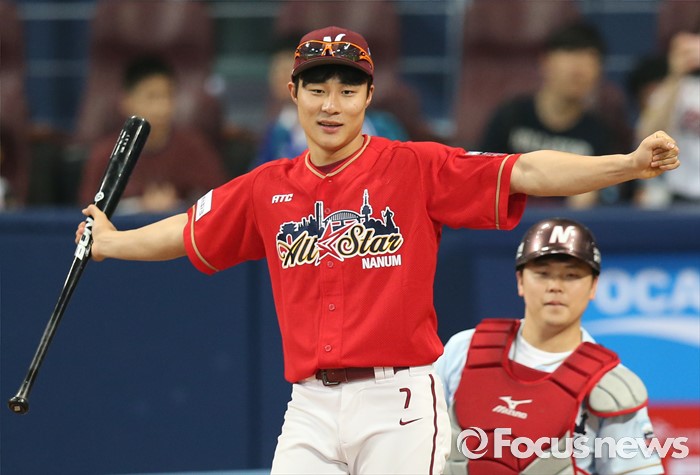 (서울=포커스뉴스) 16일 서울 고척 스카이돔에서 열린 2016 프로야구 올스타 경기에 앞서 가진 번트왕 대회에서 나눔팀의 김하성이 타구의 진행 방향을 보며 몸을 쓰고 있다.