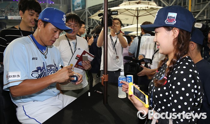 (서울=포커스뉴스) 16일 서울 고척 스카이돔에서 열린 2016 프로야구 올스타 경기에 앞서 가진 팬사인회에서 드림팀의 이승엽이 여성팬에게 공에 사인을 해 주고 있다.