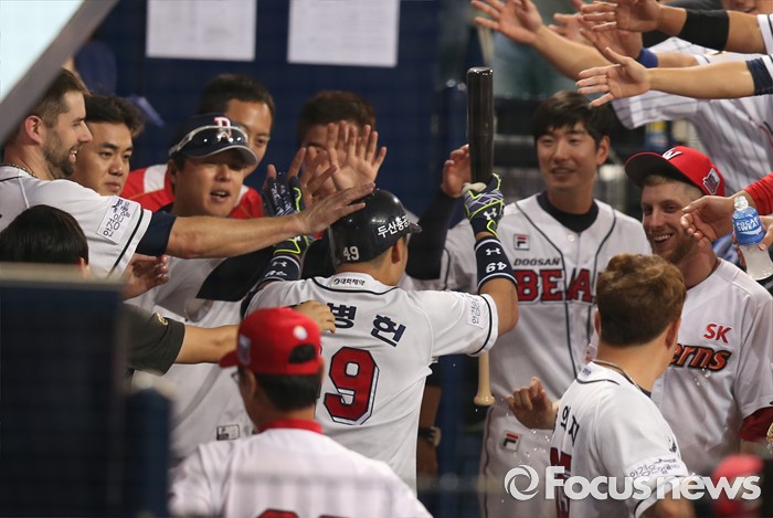 | △ 더그아웃에서 환영받는 드림팀 민병헌 |