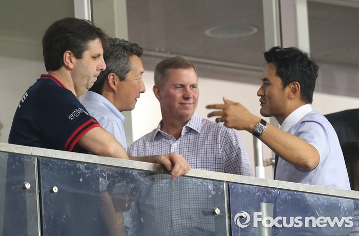 (서울=포커스뉴스) 16일 서울 고척 스카이돔에서 열린 2016 프로야구 올스타 경기에서 박찬호가 마크 리퍼트 미국대사등 관계자와 대화하고 있다.
