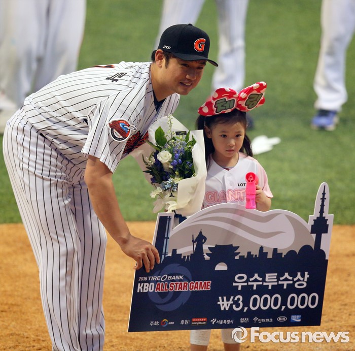 (서울=포커스뉴스) 16일 서울 고척 스카이돔에서 열린 2016 프로야구 올스타전에서 드림팀 손승락이 우수투수상을 받고 딸과 함꼐 포즈를 취하고 있다.