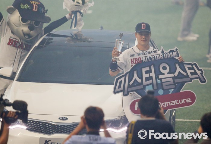 (서울=포커스뉴스) 16일 서울 고척 스카이돔에서 열린 2016 프로야구 올스타전에서 MVP로 선정된 드림팀의 민병헌이 부상으로 받은 승용차에 올라 앉아 기념사진을 찍고 있다.