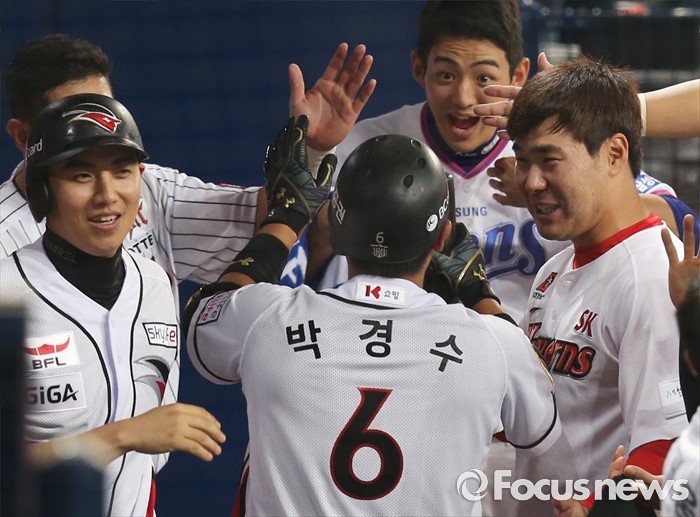 (서울=포커스뉴스) 16일 서울 고척 스카이돔에서 열린 2016 프로야구 올스타 경기 7회말 1사후 드림팀 박경수가 좌월 솔로 홈런을 치고 더그아웃에서 동료들의 열렬한 환영을 받고 있다.