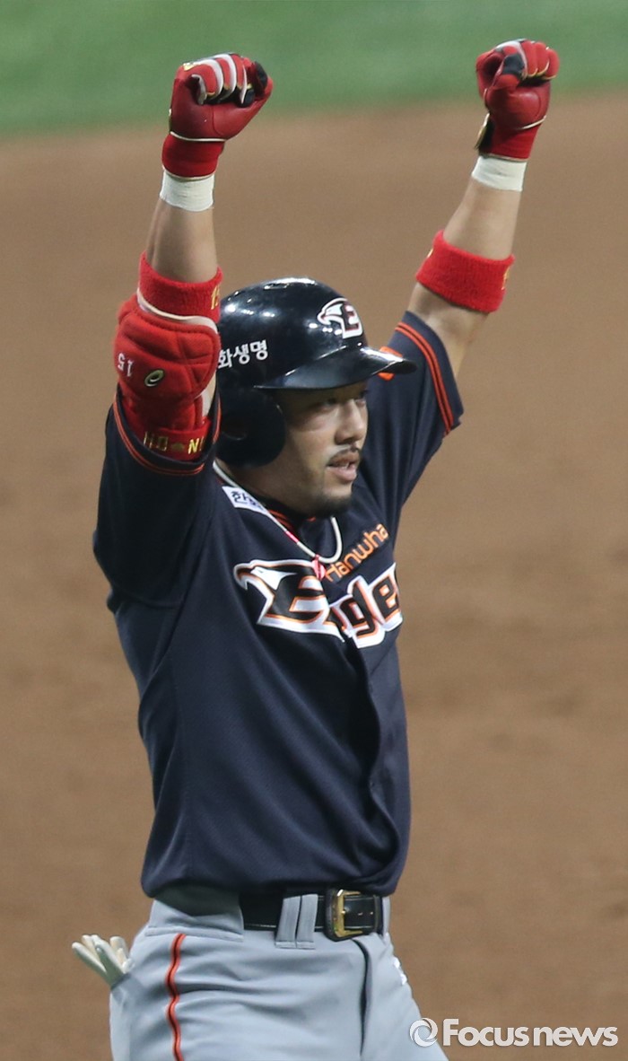 (서울=포커스뉴스) 16일 서울 고척 스카이돔에서 열린 2016 프로야구 올스타 경기에서 3회초 1사후 나눔팀 이용규가 우중간 3루타를 치고 3루에서 두 손을 번쩍들고 환호하고 있다.