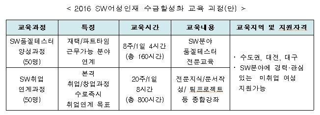 출산, 육아 등으로 풀타임 근무가 어려운 여성을 위해 파트타임·재택근무 가능한 ‘SW품질테스터 양성과정’과 본격적인 SW분야 취업과정인 ‘SW여성인력 취업 연계과정’으로 구성하며, 올해는 수도권과 지역 2개 도시(대전, 대구)에서 진행될 예정이다.