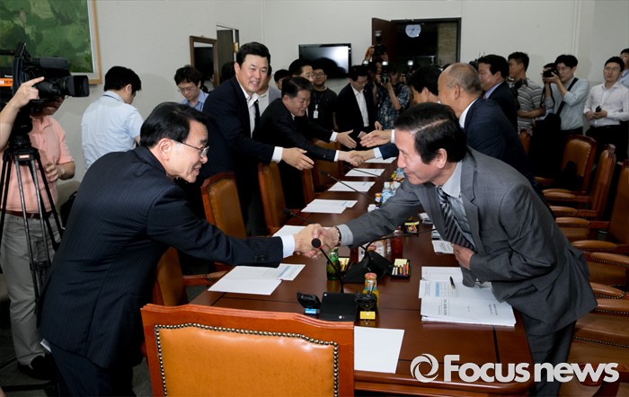 (서울=포커스뉴스) 18일 오전 서울 여의도 국회에서 열린 외교통일위원장 및 3당 간사단과 통일부, 개성공단 기업협의회 임원진 긴급간담회에 참석한 심재권(왼쪽) 외통위원장과 정기섭 개성공단입주기업 비대위 대표공동위원장 등 참석자들이 인사하고 있다.