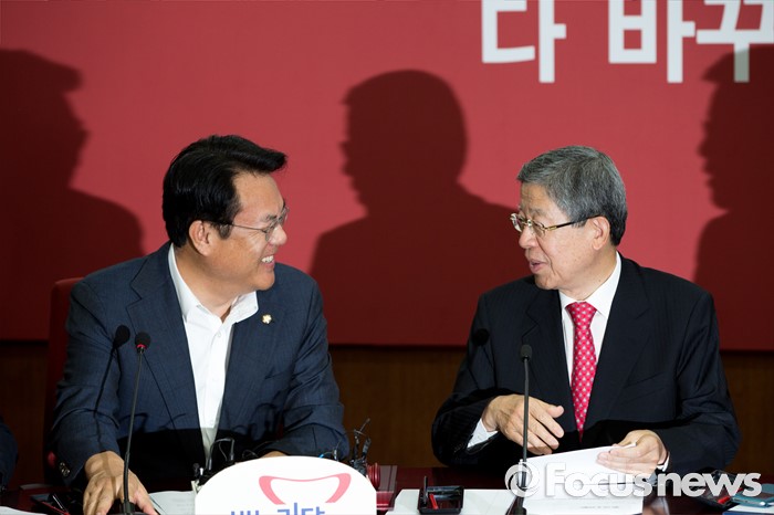 (서울=포커스뉴스) 김희옥(오른쪽) 새누리당 혁신비상대책위원장과 정진석 원내대표가 18일 오전 서울 여의도 새누리당사에서 열린 혁신비상대책위원회의에 참석해 대화 하고 있다.