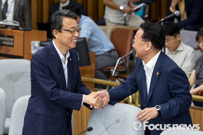 (서울=포커스뉴스) 김성식(왼쪽) 국민의당 정책위의장과 유일호 경제부총리 겸 기획재정부 장관이 18일 오전 서울 여의도 국회에서 열린 '3당 정책위의장-경제부총리, 3차 민생경제 현안점검회의'에 참석해 악수 하고 있다.