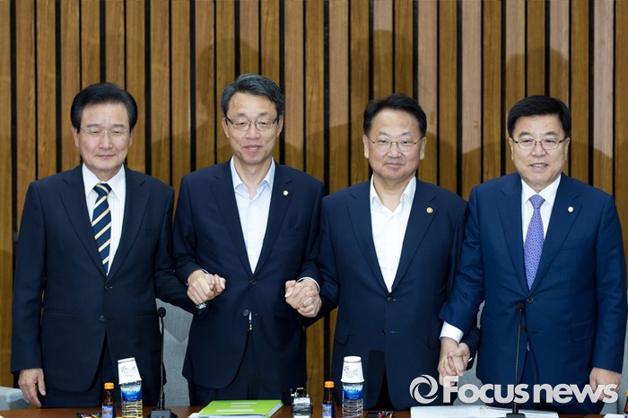 | △ 손 맞잡은 여야3당 정책위의장-경제부총리 |