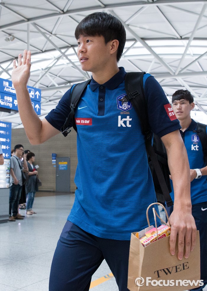 (인천공항=포커스뉴스) 2016년 리우데자네이루 올림픽 메달에 도전하는 올림픽 축구 국가대표팀 권창훈이 18일 오후 인천국제공항에서 브라질 상파울루로 출국하기 위해 이동하며 취재진을 향해 인사하고 있다.