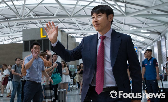 (인천공항=포커스뉴스) 2016년 리우데자네이루 올림픽 메달에 도전하는 신태용 올림픽 축구 국가대표팀 감독이 18일 오후 인천국제공항에서 브라질 상파울루로 출국하기 위해 이동하며 취재진을 향해 인사하고 있다.