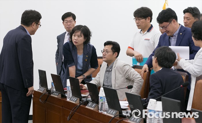 (서울=포커스뉴스) 18일 오후 서울 여의도 국회에서 가습기살균제 사고 진상규명과 피해구제 및 재발방지 대책마련을 위한 국정조사특별위원회 전체회의를 마친 우원식 위원장, 홍익표 더불어민주당 간사, 송기석 국민의당 간사, 이정미 정의당 의원 등이 논의하고 있다.