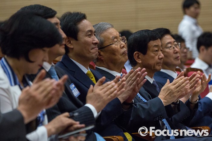 (서울=포커스뉴스) 김종인(왼쪽 네 번째) 더불어민주당 비상대책위 대표와 우상호(왼쪽 세 번째) 원내대표가 18일 오후 서울 여의도 국회의원회관에서 열린 '더불어민주당 중앙위원회의'에 참석해 박수 치고 있다.