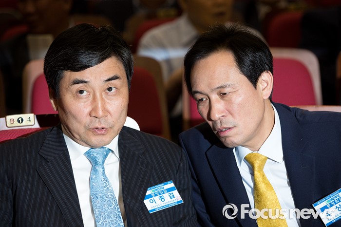 (서울=포커스뉴스) 우상호(오른쪽) 더불어민주당 원내대표와 이종걸 전 원내대표가 18일 오후 서울 여의도 국회의원회관에서 열린 '더불어민주당 중앙위원회의'에 참석해 대화 하고 있다.