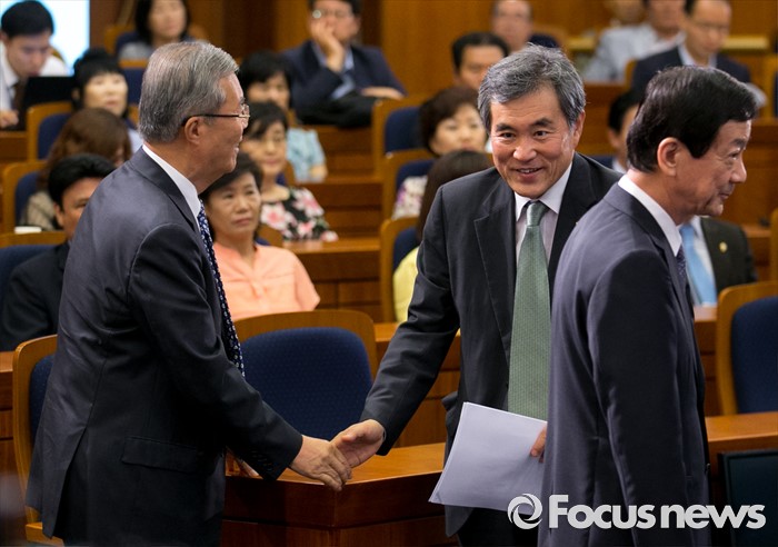(서울=포커스뉴스) 18일 오후 서울 여의도 국회 헌정기념관에서 한국적 제3의 길 후원으로 열린 '개헌을 말하다 의원 대담, 어떤 헌법인가?'에 참석한 김종인(왼쪽) 더불어민주당 비대위 대표가 대담에 나선 이상돈(가운데) 국민의당 의원과 악수하고 있다.