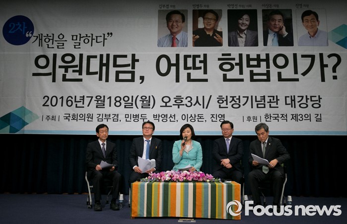 (서울=포커스뉴스) 18일 오후 서울 여의도 국회 헌정기념관에서 한국적 제3의 길 후원으로 열린 '개헌을 말하다 의원 대담, 어떤 헌법인가?'에 참석한 진영(왼쪽부터), 민병두, 박영선, 김부겸 더불어민주당 의원, 이상돈 국민의당 의원이 대담을 하고 있다.