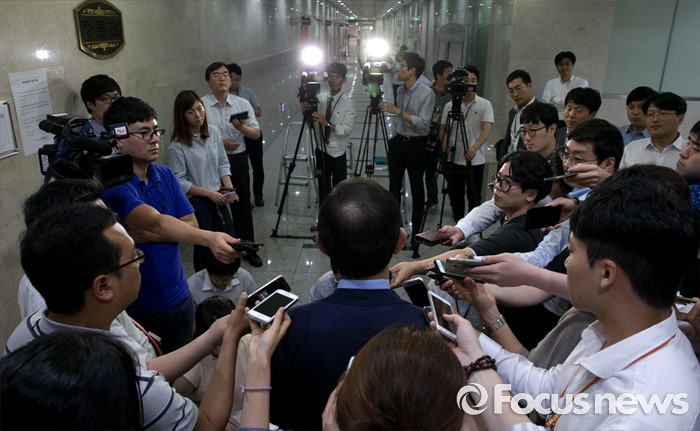 (서울=포커스뉴스) 전당대회 출마를 선언한 주호영 새누리당 의원이 18일 오후 서울 여의도 국회 정론관에서 추가로 공개된 윤상현 의원의 공천개입 녹취록과 관련 성명서를 발표한 뒤 취재진 질문에 답하고 있다.