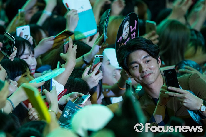 (서울=포커스뉴스) 18일 오후 서울 영등포구 타임스퀘어에서 열린 영화 '부산행' 레드카펫 행사에 참석한 배우 공유가 팬들과 함께 셀카를 찍고 있다.