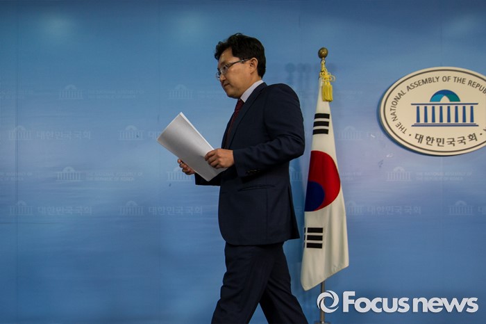 (서울=포커스뉴스) 김용태 새누리당 의원이 19일 오전 서울 여의도 국회에서 윤상현 의원의 공천개입 의혹 관련 입장발표를 마친 뒤 기자회견장을 나서고 있다.