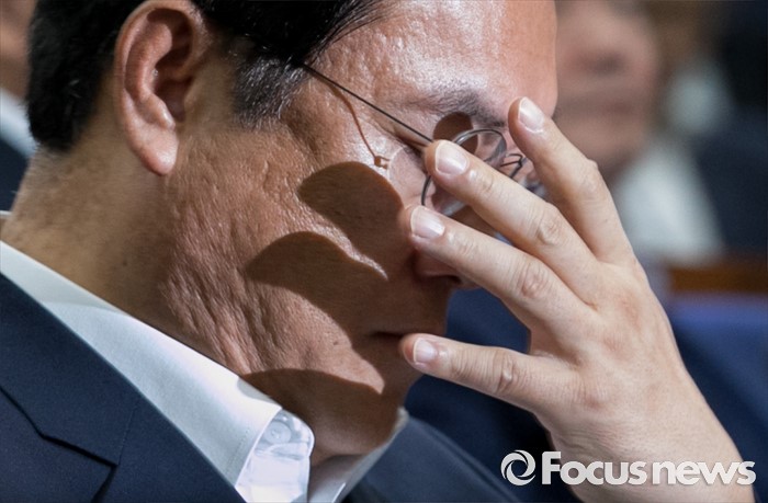 (서울=포커스뉴스) 19일 오전 서울 여의도 국회에서 열린 새누리당 의원총회에 참석한 정진석 원내대표가 얼굴을 만지고 있다.
