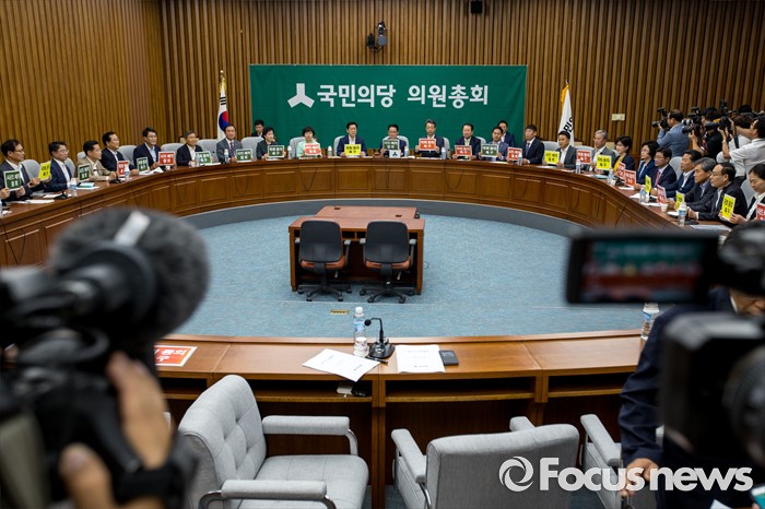 (서울=포커스뉴스) 박지원(가운데) 국민의당 비상대책위원장을 비롯한 의원들이 19일 오전 서울 여의도 국회에서 열린 의원총회에 참석해 사진촬영을 하기 위해 '사드배치 철회'를 촉구하는 피켓을 들고 있다.