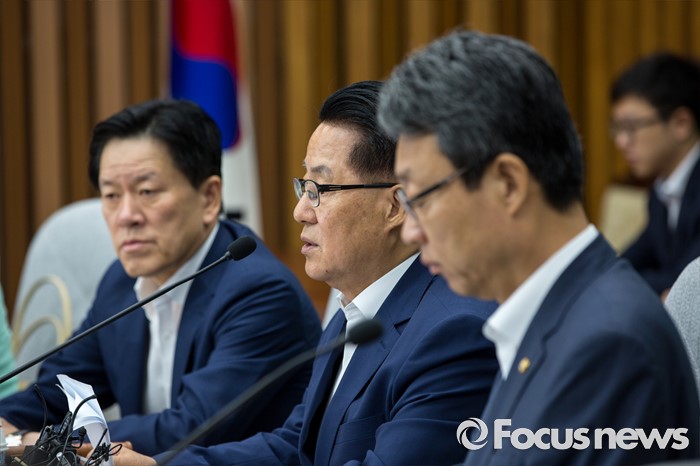 (서울=포커스뉴스) 박지원 국민의당 비상대책위원장과 김성식 정책위의장이 19일 오전 서울 여의도 국회에서 열린 의원총회에 참석해 모두발언 하고 있다.