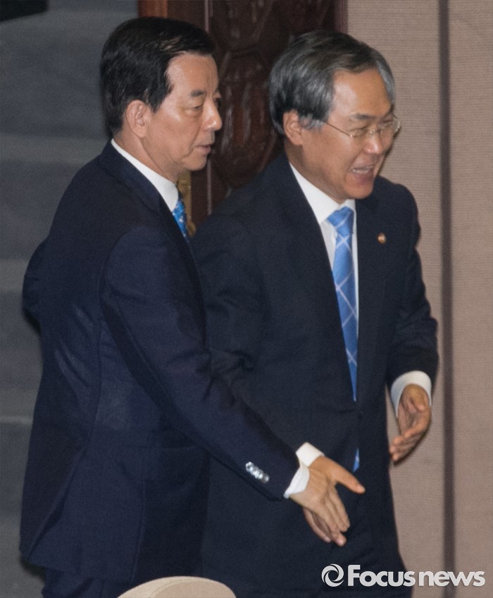(서울=포커스뉴스) 19일 오전 서울 여의도 국회에서 열린 344회 국회(임시회) 1차 본회의, 사드(THAAD·고고도미사일방어체계) 배치에 대한 긴급현안질문에 참석한 한민구(왼쪽) 국방부 장관과 우윤근 국회 사무총장이 인사하고 있다.