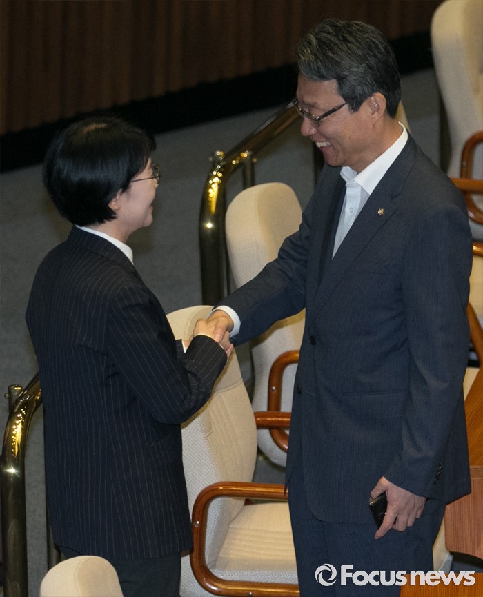 (서울=포커스뉴스) 19일 오전 서울 여의도 국회에서 열린 344회 국회(임시회) 1차 본회의, 사드(THAAD·고고도미사일방어체계) 배치에 대한 긴급현안질문에 참석한 김성식(오른쪽) 국민의당 정책위의장과 박선숙 의원이 인사하고 있다.