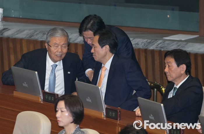 (서울=포커스뉴스) 19일 오전 서울 여의도 국회에서 열린 344회 국회(임시회) 1차 본회의, 사드(THAAD·고고도미사일방어체계) 배치에 대한 긴급현안질문에 참석한 김종인 더불어민주당 비대위 대표, 우상호 원내대표, 김영춘 의원이 대화하고 있다.