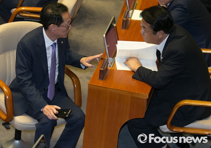 (서울=포커스뉴스) 19일 오전 서울 여의도 국회에서 열린 344회 국회(임시회) 1차 본회의, 사드(THAAD·고고도미사일방어체계) 배치에 대한 긴급현안질문에 참석한 정진석(오른쪽) 새누리당 원내대표와 김도읍 원내수석부대표가 대화하고 있다.