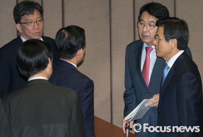 (서울=포커스뉴스) 19일 오전 서울 여의도 국회에서 344회 국회(임시회) 1차 본회의, 사드(THAAD·고고도미사일방어체계) 배치에 대한 긴급현안질문을 마친 뒤 심재철 국회 부의장과 황교안 국무총리, 한민구 국방부 장관, 윤병세 외교부 장관 등이 대화하고 있다.