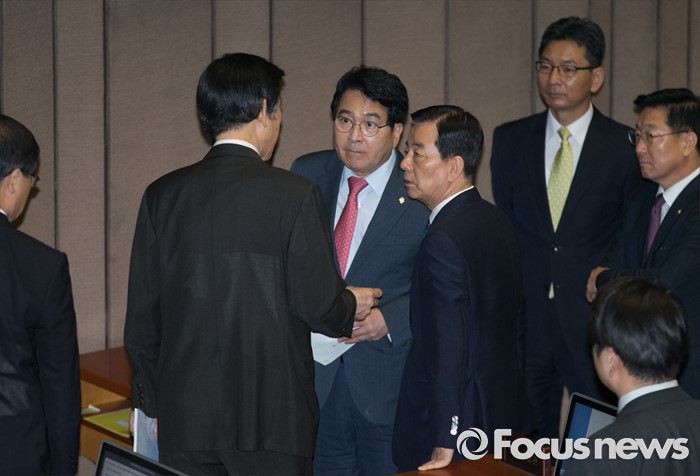 (서울=포커스뉴스) 19일 오전 서울 여의도 국회에서 344회 국회(임시회) 1차 본회의, 사드(THAAD·고고도미사일방어체계) 배치에 대한 긴급현안질문을 마친 뒤 심재철 국회 부의장과 한민구 국방부 장관, 윤병세 외교부 장관 등이 대화하고 있다.