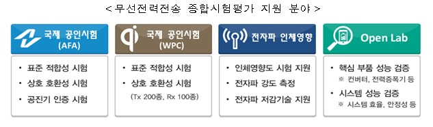 최영해 미래부 전파정책국장은 “글로벌 수준의 지원센터 개소는 국내 중소기업이 글로벌 강소기업으로 성장할 수 있는 발판이 될 것으로 기대되며, 앞으로도 관련 시설·장비 등을 확충해 중소·중견 기업들에게 더 높은 품질의 기술지원을 제공하도록 노력하겠다”고 밝혔다.무선전력전송 종합시험평가 지원 분야.<그림제공=미래부>