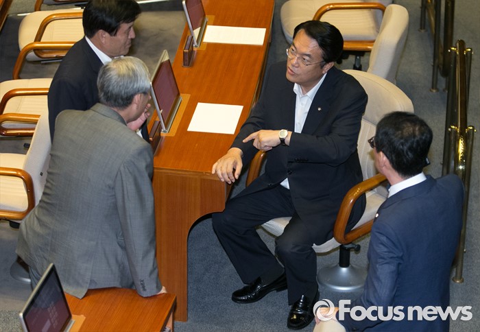 (서울=포커스뉴스) 19일 오후 서울 여의도 국회에서 열린 344회 국회(임시회) 1차 본회의, 사드(THAAD·고고도미사일방어체계) 배치에 대한 긴급현안질문에 참석한 정진석 새누리당 원내대표와 의원들이 대화하고 있다.