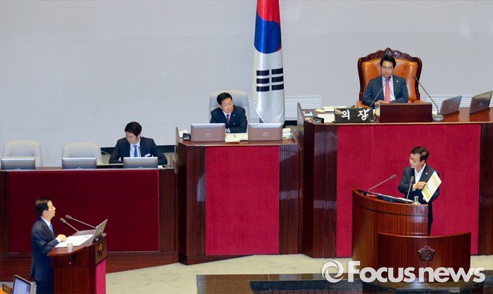 (서울=포커스뉴스) 19일 오후 서울 여의도 국회에서 열린 344회 국회(임시회) 1차 본회의, 사드(THAAD·고고도미사일방어체계) 배치에 대한 긴급현안질문에 참석한 이완영 새누리당 의원이 국방부 설명자료를 보여주며 한민구 국방부 장관에게 질문하고 있다.