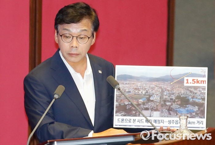 (서울=포커스뉴스) 19일 오후 서울 여의도 국회에서 열린 344회 국회(임시회) 1차 본회의, 사드(THAAD·고고도미사일방어체계) 배치에 대한 긴급현안질문에 참석한 이완영 새누리당 의원이 드론으로 촬영한 사드배치 예정지 사진을 들고 한민구 국방부 장관에게 질문하고 있다.