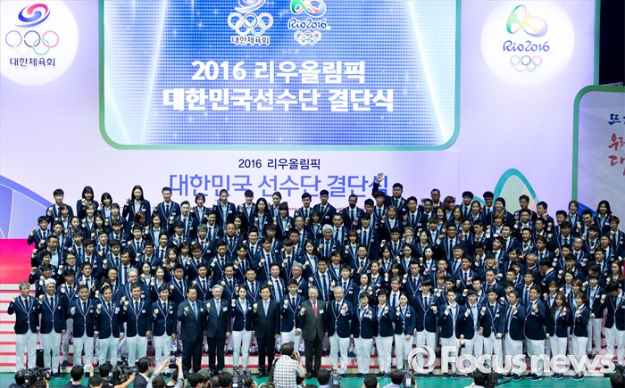 (서울=포커스뉴스) 19일 오후 서울 송파구 올림픽공원 올림픽홀에서 열린 2016 리우올림픽 대한민국 선수단 결단식에서 선수단이 기념촬영을 하고 있다.